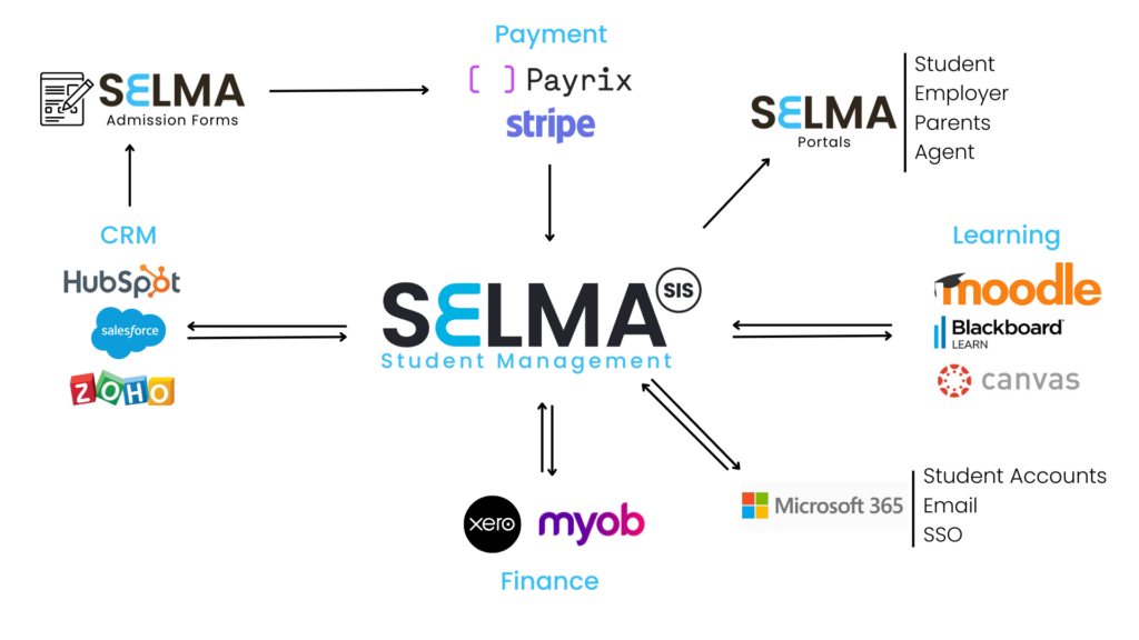 We natively integrate SELMA with admission forms, Hubspot, Salesforce, ZOHO, Payrix, stripe, xero, myob, moodle, blackboard, canvas and many more education related systems